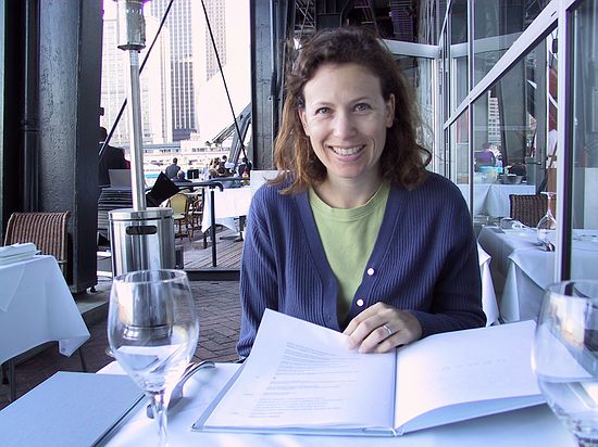 Samantha looking at the menu at "Bambu", a stylish water front restaurant in Sydney.